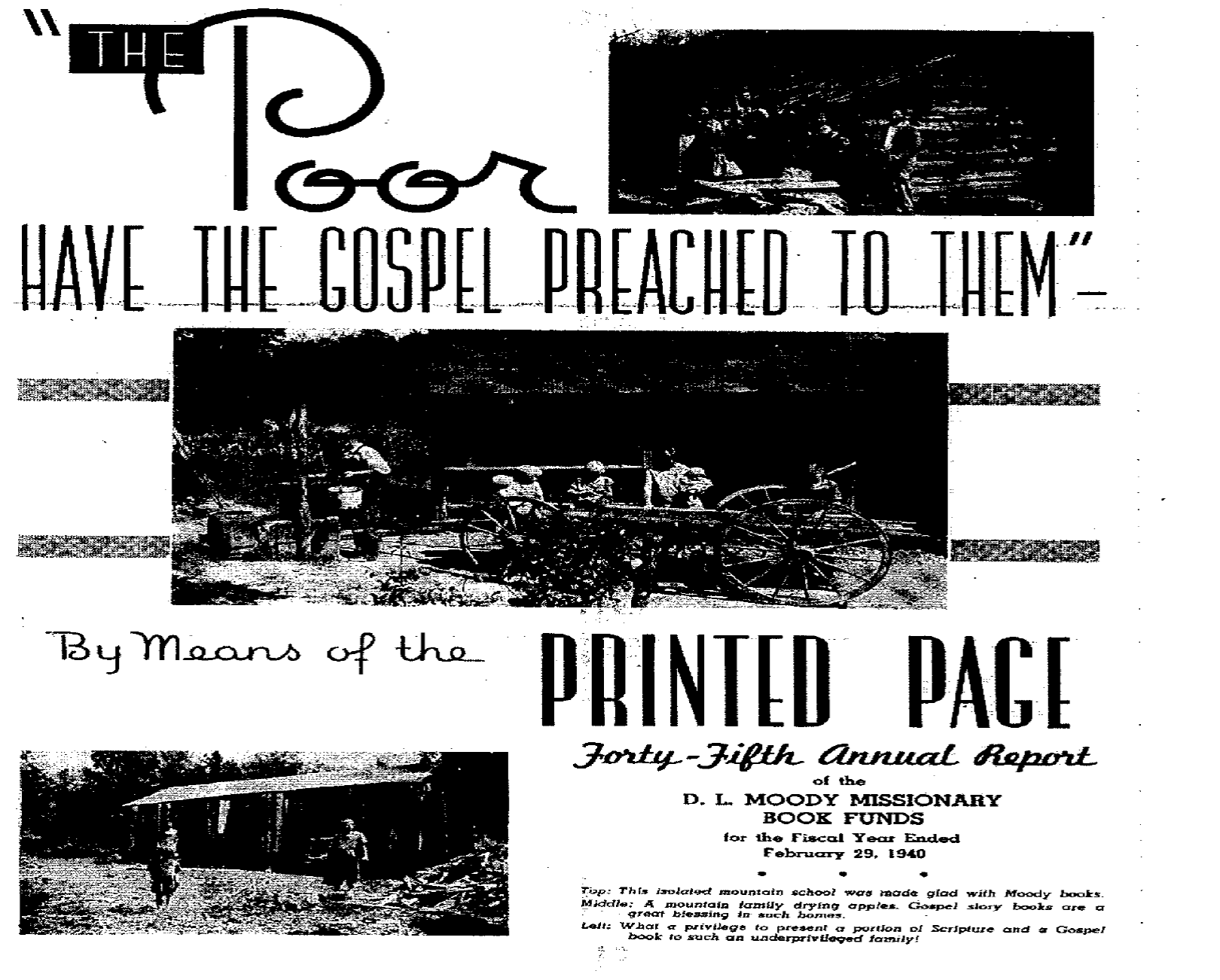 The inspiration for the Moody Bible Institute missionaries to deliver Bibles to the Southern Appalachian region came from the apparent lack of reading material of all kinds in the region. In the 1920s, ‘30s, and ‘40s, the Chicago missionaries saw the “mountaineers” as particularly ready for literature outreach. The reasons to send Bibles instead of humans were many. First of all, Bibles were cheaper and easier to crate and ship. Second, the Bible had a supernatural power to convert. As one missionary proclaimed in 1921, the Gospels formed “the most unique, the most startling, the most compelling, and most unearthly message that has ever commanded God’s attention.” No matter how talented a human missionary, he or she could not hope to compare with the words of the Gospel itself. But another reason why Bibles made good missionaries was because the people of the region desperately wanted reading material of any kind. Folks starved for reading material, the argument went, would eagerly read the Bible if only they could get one. And by reading the Bible, they would be convinced by its supernatural power; they would embrace Fundamentalist Protestantism. As one fundraising brochure from 1940 called it, this crusade could preach the gospel to the poor by using the “printed page.”
