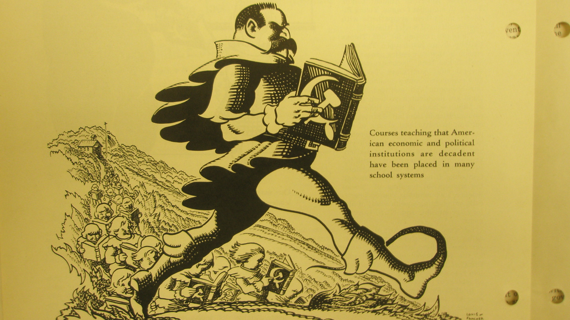 Here we see a different sort of Pied Piper. Instead of evolution or the lack of Bibles, the threat here is communistic school textbooks. Stalin as Piper is able to lead the students out of their little red schoolhouse down a dangerous path. In this use of the Pied Piper theme, the danger comes from improper, un-American teaching. But the basic message is the same.