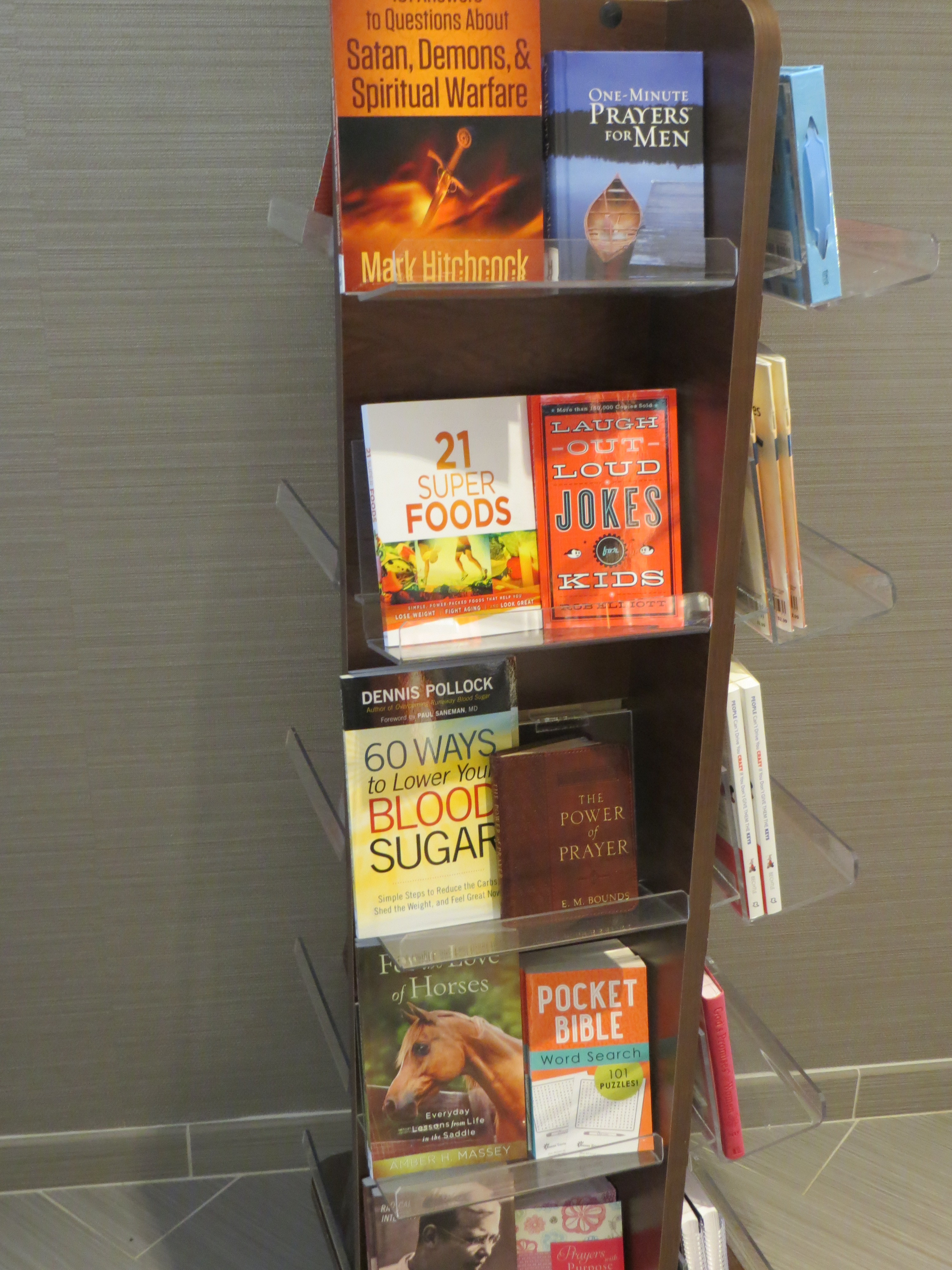 This is the kicker: Sure, fundamentalism can thrive in big cities. It can certainly thrive in the North. But down here in the South, outside of big cities, fundamentalism becomes the usual fare. It becomes the accepted norm, not just one way to be religious. Even a non-religious, totally vanilla environment such as my hotel lobby offers books that prove the scientific veracity of the Bible.