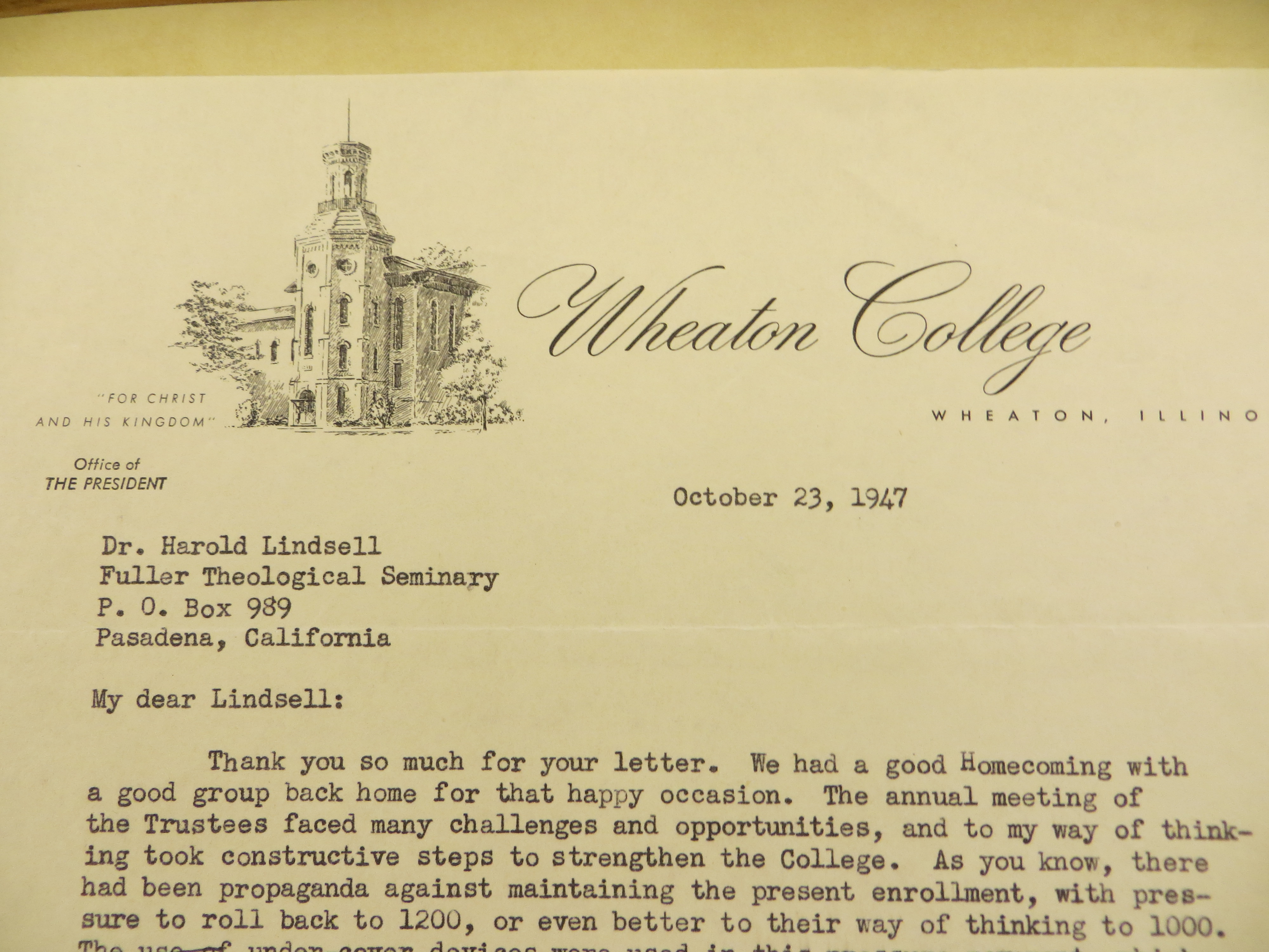 But these archives offer more than just a look at the history of Wheaton itself. Since the school was such an influential leader in the field of evangelical higher ed, its leaders kept in constant contact with other school leaders. In their correspondence, I’ll be digging to discover the issues that motivated school leaders across the entire network of conservative evangelical colleges. This will include prosaic issues such as admissions and accreditation, but also uniquely evangelical issues such as determining which schools remained orthodox and which threatened to slide into liberalism and modernism.