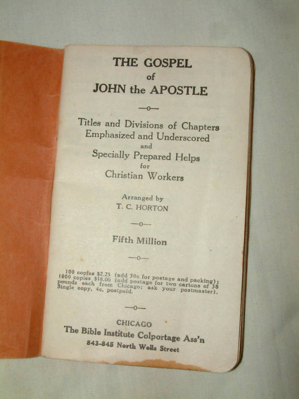 First, the Bible. The most commonly distributed Bible book wasn’t the entire Bible, but rather a special edition of the Gospel of John. This edition was edited by TC Horton in 1922. At the time, Horton was at the peak of his career. He was a minister and organizer in the Los Angeles area. He was best known in 1922 as the editor of the Kings Business, the magazine of the Bible Institute of Los Angeles (now Biola University).