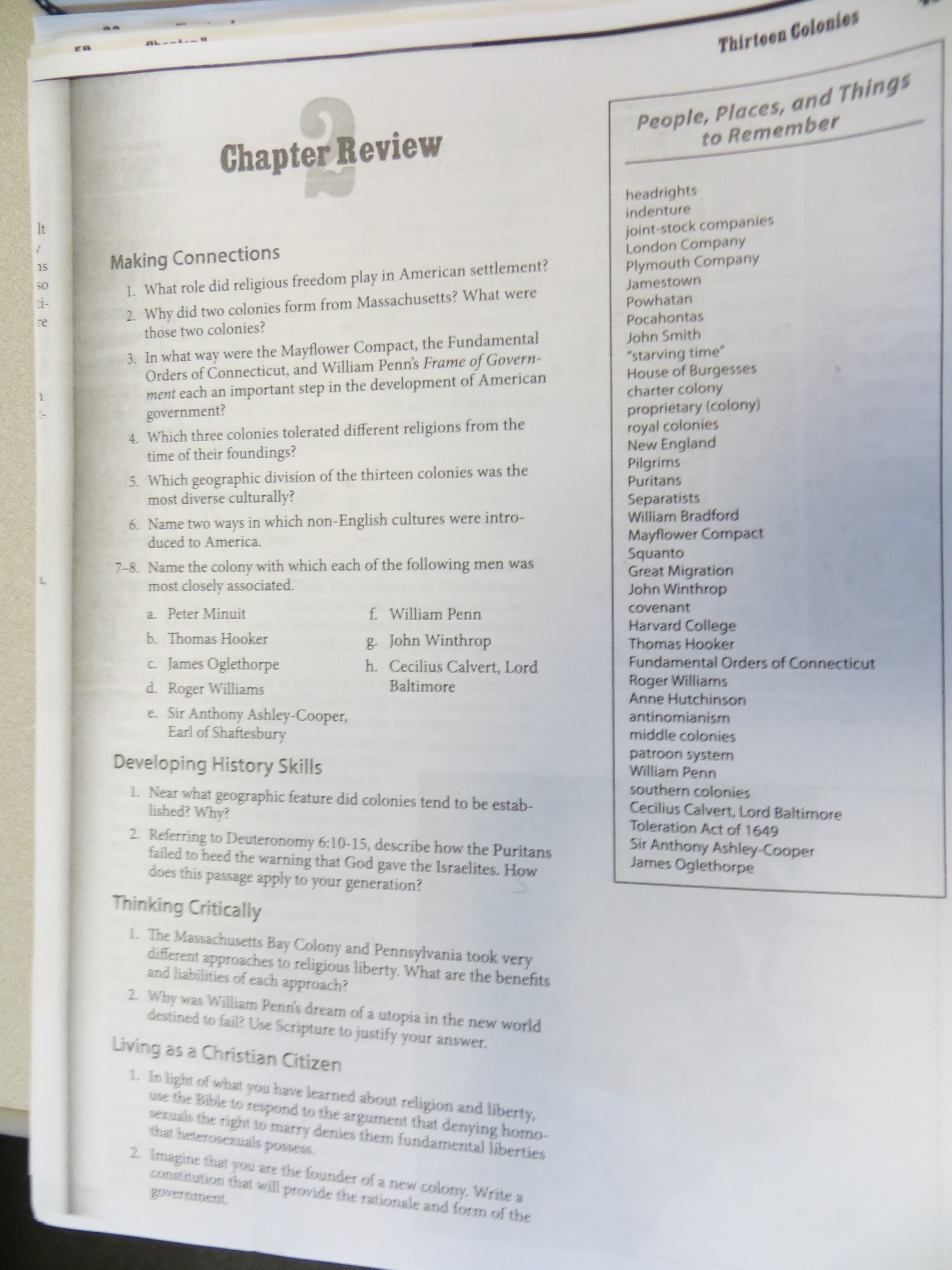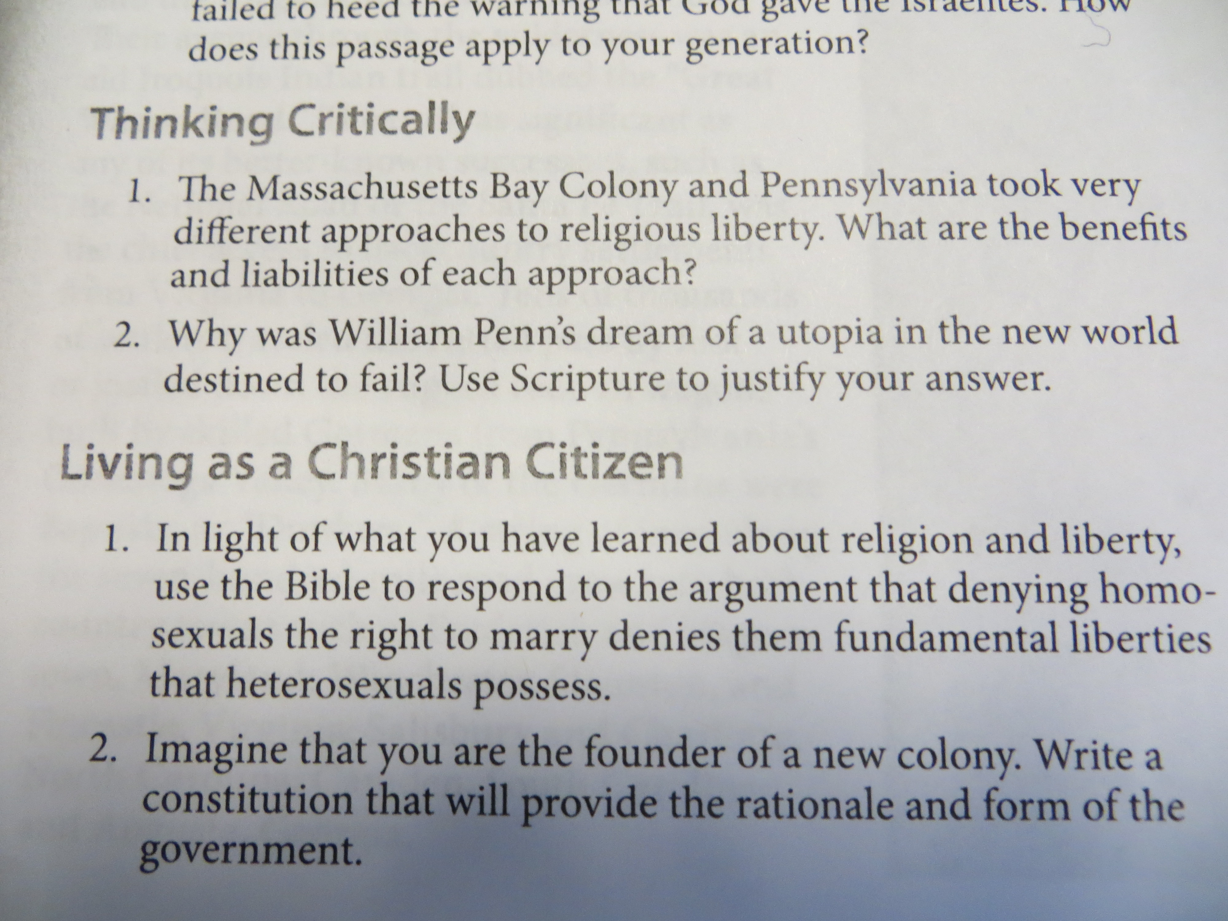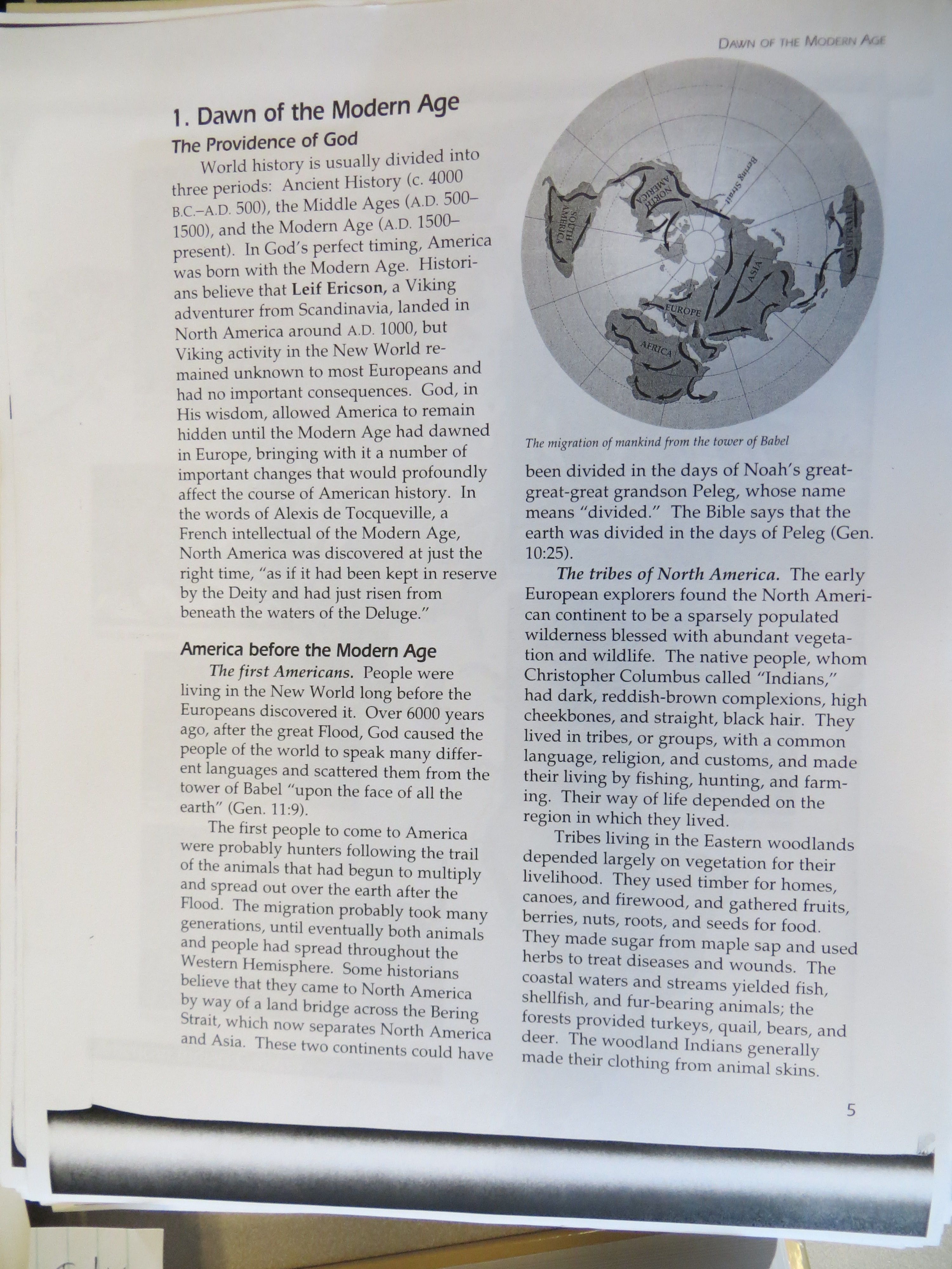 A Beka, for example, explains the origins of humanity in the Americas as the direct result of the collapse of the Tower of Babel. When that happened, people were pushed all over the earth, including into the Americas. And the BJU Press textbook asks review questions you would never find in any public-school history book: How does the early colonial history of the British teach lessons about the biblical morality of gay marriage in today’s world? What can Deuteronomy tell us about the Puritans?